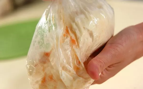 1、長芋の入っているビニール袋に明太子、<調味料>の材料を加え、袋をもんで混ぜ合わせる。