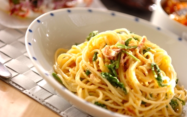 日本では、生クリームを入れるところが多いですが、本場では生クリームは不使用。濃厚だけどヘルシーな王道カルボナーラのレシピです。仕上げに春らしさ満点のクレソンをたっぷりのせれば、季節感あふれるひと皿の完成です。