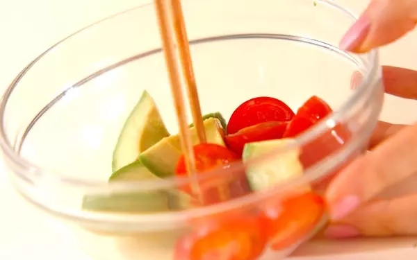 2、プチトマトは水洗いして水気を拭き取り、ヘタを取って縦2~4つに切り、(1)のアボカドに合わせる。
