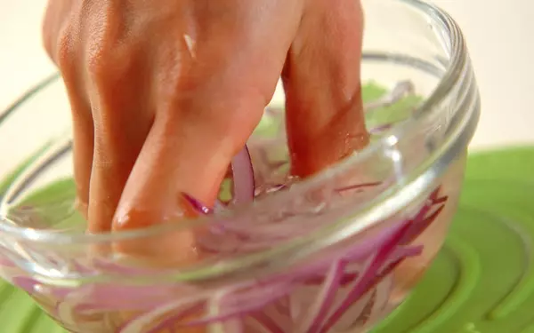 ・紫玉ネギは縦薄切りにして、水の中でもみ洗いする。レタスは、食べやすい大きさにちぎり、水に放つ。紫玉ネギ、レタスはしばらく置いて水気をしっかりきる。