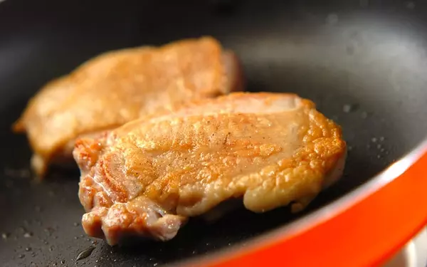 1、オリーブ油を中火で熱して、鶏もも肉を皮目を下にして5分焼く。裏返して、1分ほど焼いて白ワインを加える。蓋をして弱火で5分焼く。