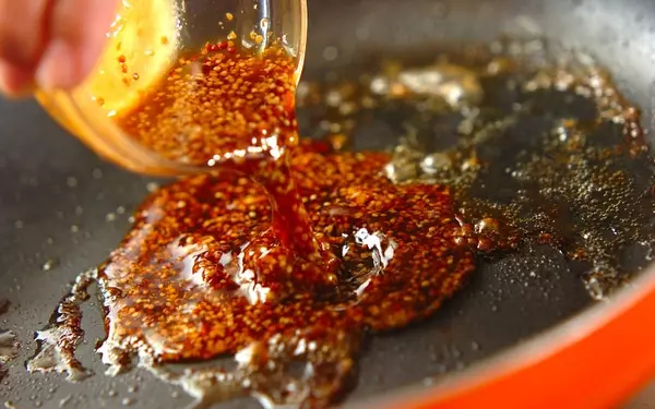 2、鶏もも肉は一旦取り出して、フライパンに<ハニーマスタードソース>の材料を加える。