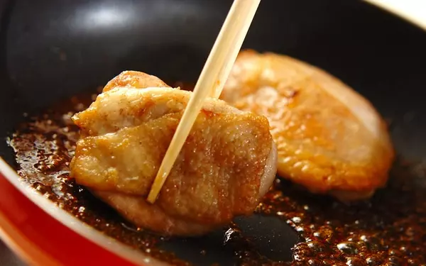 3、トロミがつくまで中火で加熱して、鶏もも肉を戻し入れる。火を止めて、レモン汁を加え混ぜる。