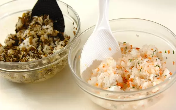 2、1/3量のご飯にサケフレークと木の芽を混ぜ合わせ、小さめのひとくち大に丸める。残りのご飯に高菜を混ぜ合わせて同じように丸める。