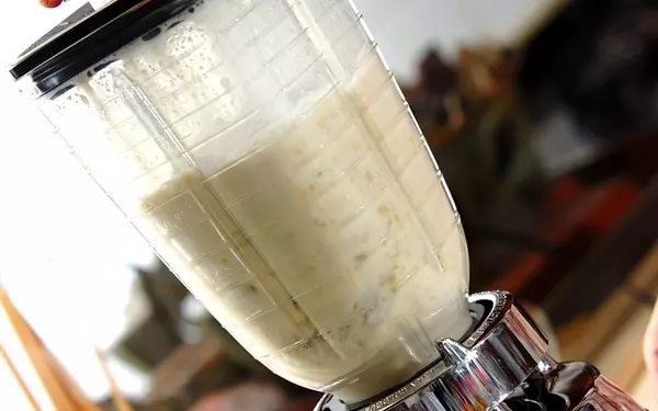 1、ミキサーに干し芋、アーモンドミルク、練り白ゴマ、ハチミツ、しょうゆを入れてかくはんする。