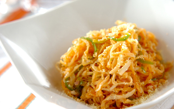 ベーコンにピーマン、ケチャップに粉チーズ… と、まるでパスタのナポリタンそのものの味付けですが、切干し大根の旨味とバターのコクもベストマッチ。