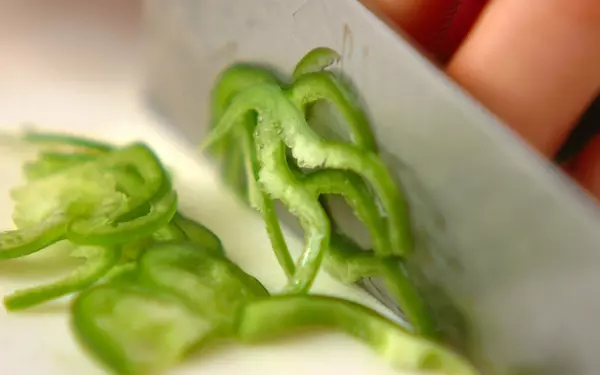 2、ベーコンは細切り、ピーマンは縦半分に切ってヘタと種を取り、横細切りにする。