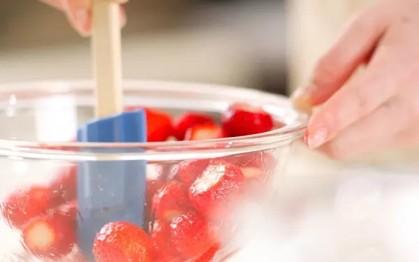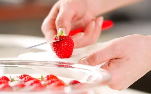 ・冷凍フルーツを作る。イチゴは塩水できれいに洗い水気を拭き取ってヘタを切り落とす。