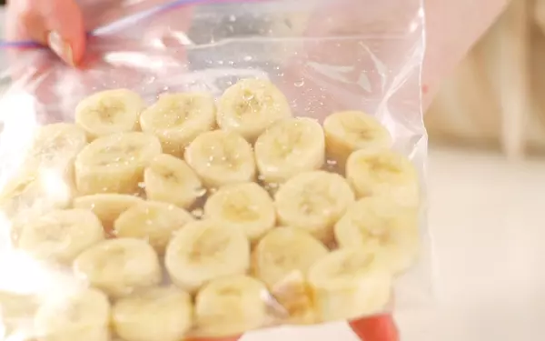 ・バナナは皮をむき、1cm幅に切ってコアントローを全体にからめて、冷凍保存袋に入れ、冷凍庫で凍らせる。
