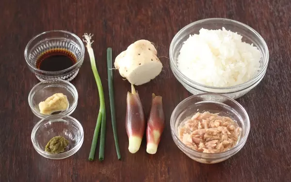 1、ごはんと柚子胡椒を混ぜ合わせる。万能ネギ、ミョウガは小口切りにする。山芋は皮をむき、1cmの角切りにする。