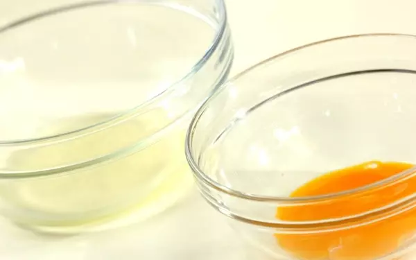 1、<生地>を作る。卵黄と卵白に分け、それぞれボウルに入れる。
