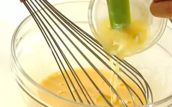 2、卵黄のボウルに生クリームを加えて混ぜ、さらに溶かしバターを加えて混ぜ合わせる。