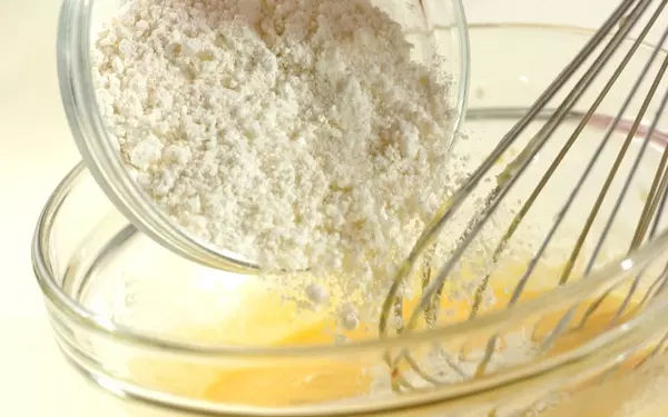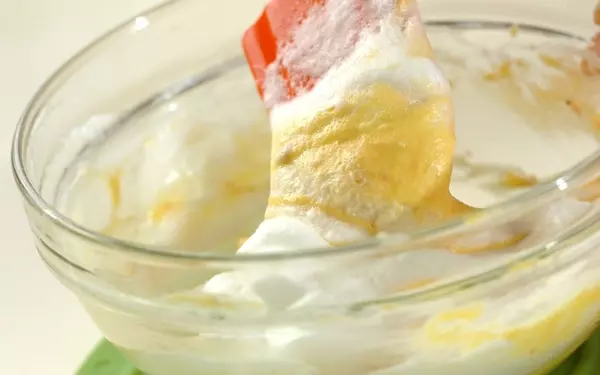 5、(3)に(4)を2~3回に分けて加え、サックリと混ぜ合わせる。
