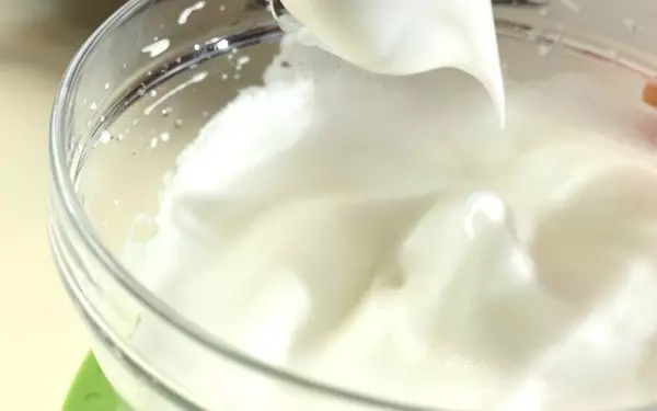 4、卵白の入ったボウルに砂糖を加え、ハンドミキサーでツンと角が立つまで泡立てる(メレンゲ)。
