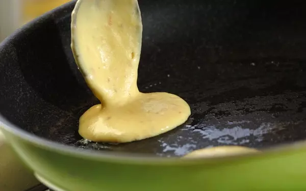 6、フライパンにサラダ油を薄くひいて熱し、(5)をひとくち大ずつ流し入れ、弱火で両面焼き色がつくまで焼く。
