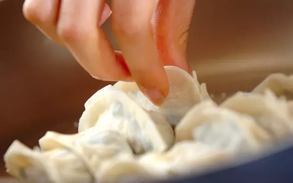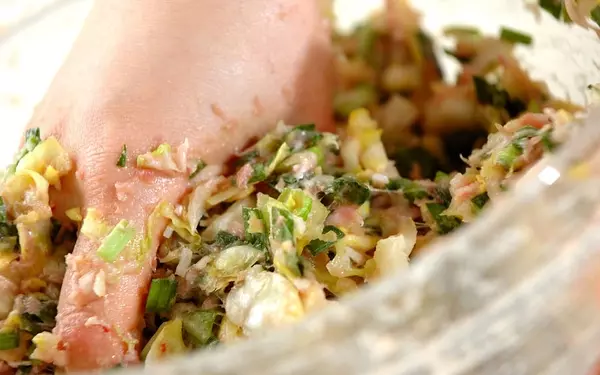 2、手のひらに餃子の皮をのせ、混ぜ合わせた<タネ>をのせ、餃子に皮の縁に水を薄く付け、ひだをとりながら形を整え、包み込む。