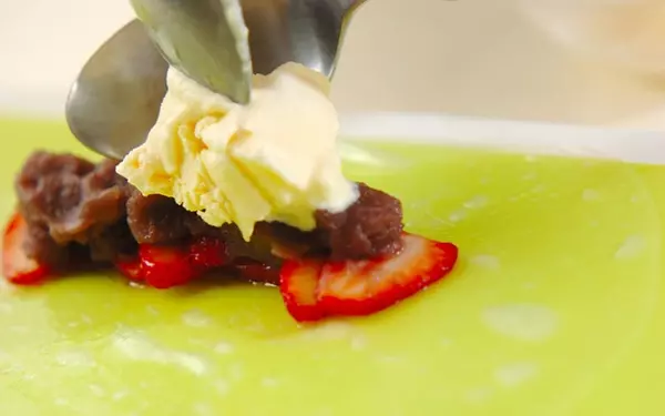 アイスクリームを乗せたらすぐに包むことがポイントです。溶け出しにくいようにしっかりと巻き込みましょう。ライスペーパーからうっすら姿をのぞかせるいちごがかわいらしさをUPしてくれます。