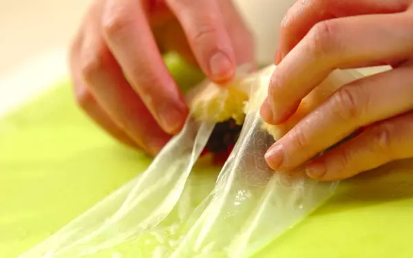 2、手前からライスペーパーの端をかぶせ、左右を内側に折り、しっかり巻き込む。