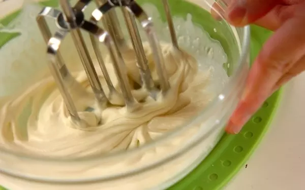 1、<ホットケーキ生地>の材料をすべて混ぜ、滑らかになったら冷蔵庫に入れておく。<メイプルクリーム>の材料を合わせ、7分立てにしたら冷蔵庫に入れておく。
