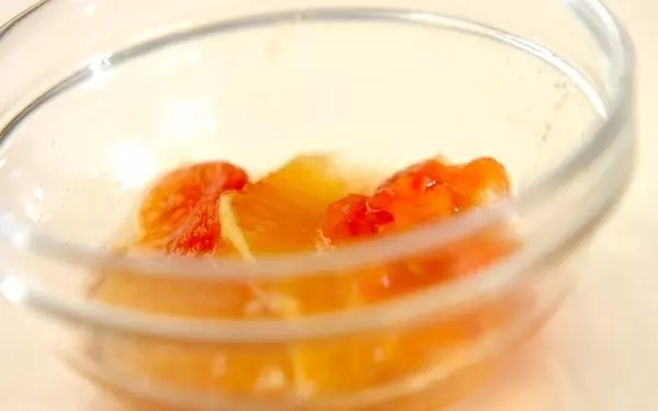 2、オレンジは皮をむいて房から出し、ワタは取り除き、一房のみ1cm大に切る。プチトマトは湯むきして横半分に切り、種を取る。1/2個分のみ1cm大に切る。<マリネ液>の材料をボウルに合わせ、1cm大に切った以外のオレンジとプチトマトをすべて入れよく混ぜる。