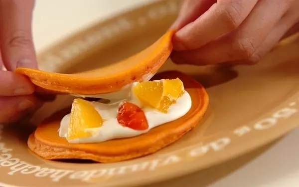4、<メイプルクリーム>に1cm大にしたオレンジ、プチトマトを加え、焼けた生地に挟む。皿の脇に残りのオレンジとプチトマトのマリネを添え、仕上げに分量外のメイプルシロップ(適量)をかける。