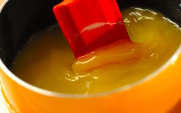 1、鍋にオレンジジュース、砂糖を入れて火にかける。砂糖が溶けたら火を止め、ふやかしたゼラチンを加えて余熱で溶かす。