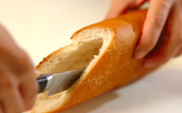 1、バゲットは縁1cmを残して、ぺティナイフで切り込みを入れ、中身を取り出す。