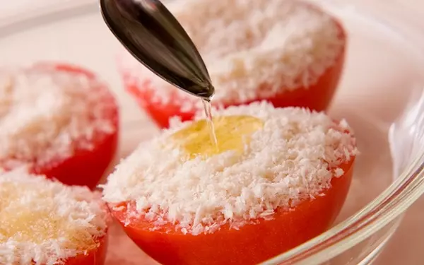 2、トマトの切り口に砂糖を振り、パン粉を散らせてオリーブ油を掛け、オーブンに入れ25~30分焼く。