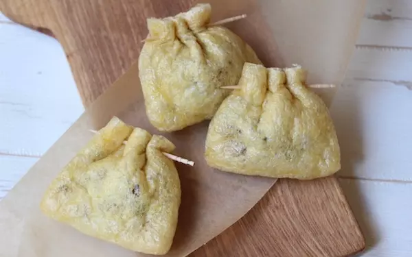 3、油揚げを横半分に切り、2を詰めてようじで口をとめる。