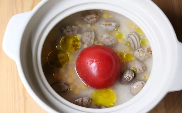 2、土鍋に1、トマト、あさり、水気を切ったコーン、塩とオリーブオイルを入れて中火にかける。