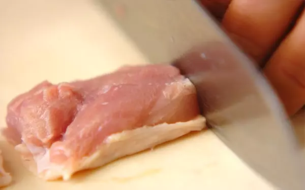 1、鶏もも肉は身の厚い部分に包丁を入れて厚みを均等にし、ひとくち大に切って<下味>の材料をまぶす。<調味料>の材料を混ぜ合わせる。ルッコラは刻む。