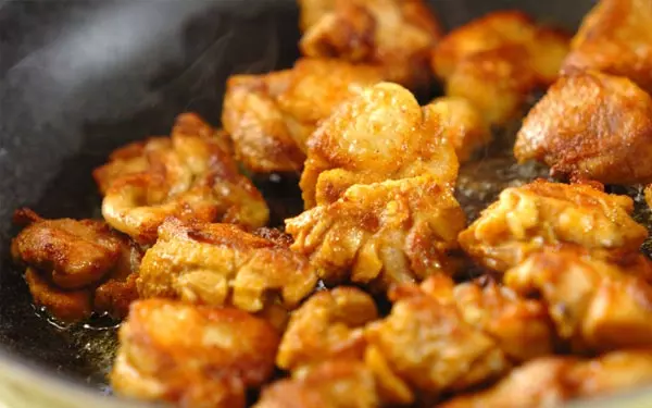 2、フライパンを熱してバターを溶かし、鶏もも肉の皮面を下にして並べ入れ、返しながら火を通す。