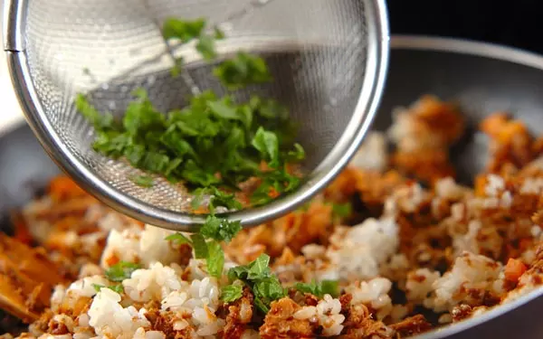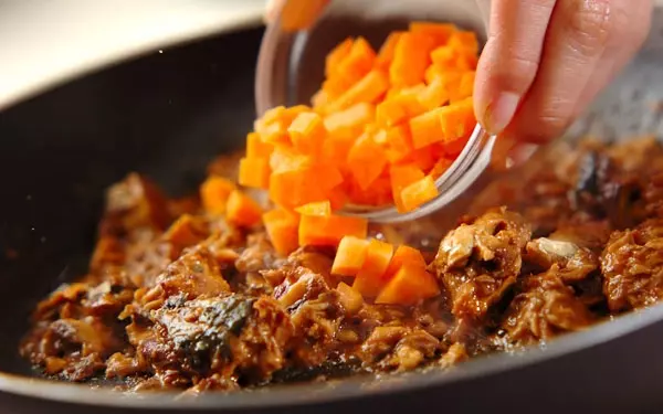 1、フライパンにサバ缶を汁ごと入れ、木ベラなどでほぐしながら炒め、ニンジンを加えて汁気がなくなるまで炒め合わせる。