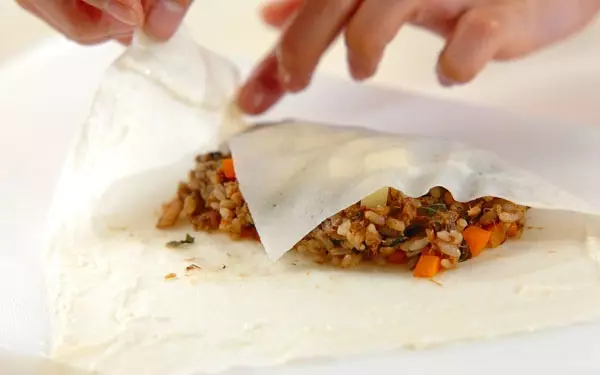 3、春巻きの皮に(2)を1/4量のせ、プロセスチーズをご飯に埋め込むようにのせる。春巻きの皮の手前を巻き込んで左右を折り、手前からクルクル巻き、巻き終わりは<小麦粉のり>で留める(4本作る)。