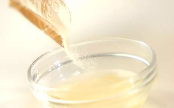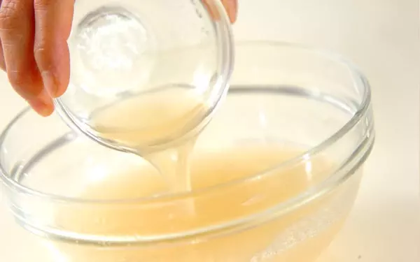 2、耐熱容器に白ワインを入れ、粉ゼラチンを振り入れてふやかし、ラップをしないで電子レンジで20~30秒加熱し、完全に溶かす。電子レンジは600Wを使用しています。