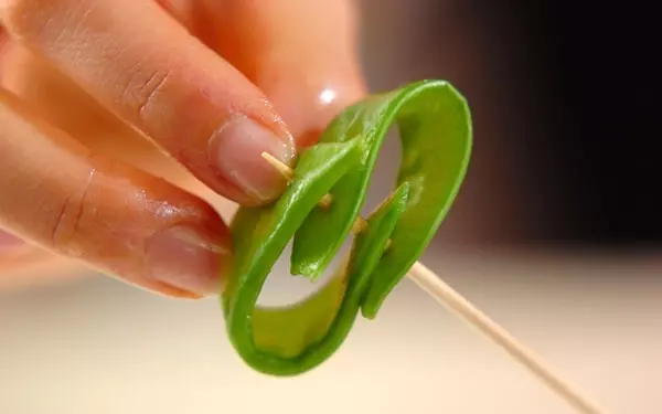 3、(2)の粗熱が取れたらラップを外し、キヌサヤを2枚葉っぱになるように刺し、ミートボールを3個ずつ串に刺す。