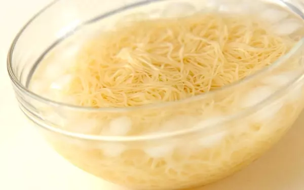 2、たっぷりの熱湯に塩を加え、スパゲティーを袋の表示時間より1分長くゆで、流水でサッと洗って氷水で冷やし、ザルに上げて水気をよくきる。