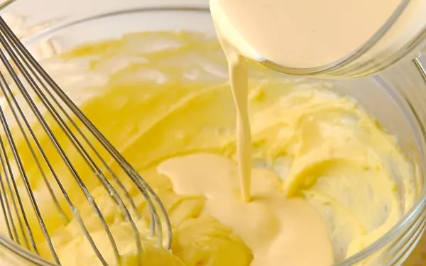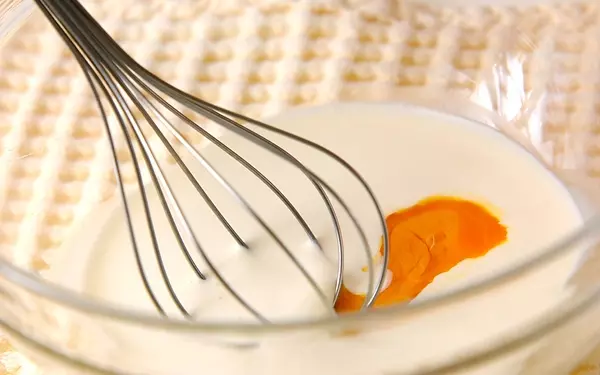 2、別のボウルに卵黄と生クリームを入れ良く混ぜておく。