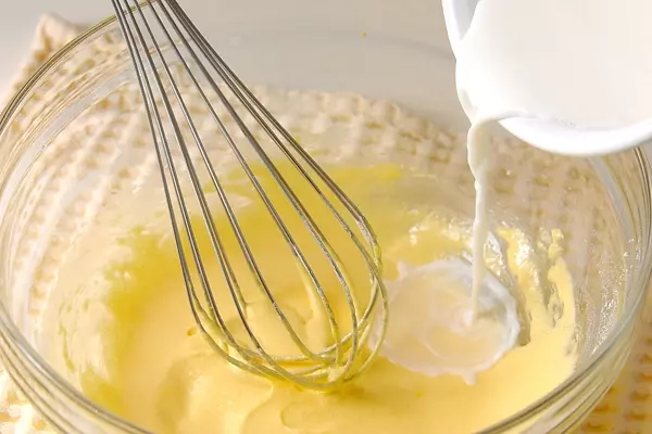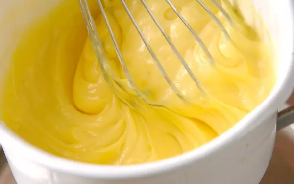 そのボウルに温めた牛乳を入れ、よく混ぜたらもう一度鍋に戻してとろみがつくまで火を入れる。出来上がったらラップを敷いたバットに移して粗熱をとる。