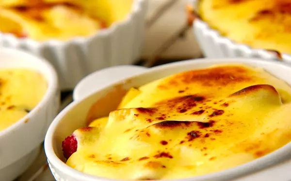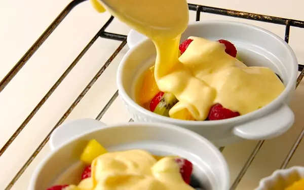 4、ブリュレ皿にお好きなフルーツをカットして乗せ、さらに出来上がったクリームを適量のせる。