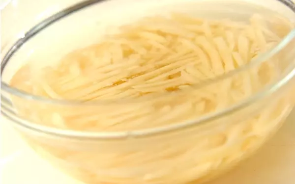 ジャガイモを水にさらすことで、変色を防ぎ、ジャガイモの切断面からしみ出たデンプン質を洗い流せるため、炒めてもジャガイモ同士がくっつかず、おいしく仕上がります。