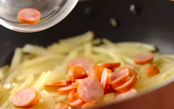 1、フライパンにオリーブ油を熱してジャガイモを炒め、まわりが透明になったらソーセージと赤唐辛子を加え、炒め合わせる。