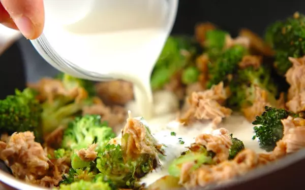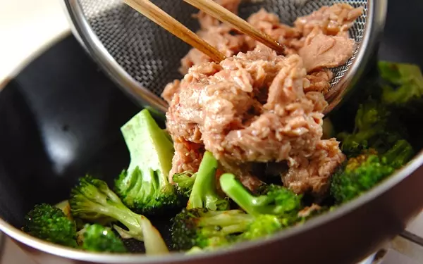 1、フライパンにオリーブ油を熱し、ブロッコリーを炒める。少し焼き色がついたら、ツナを加えて炒め合わせる。