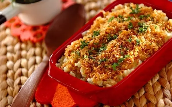 具材を器に重ねて、最後に熱々のパン粉をのせれば、あっという間に出来上がり! 大皿に盛りつけて、スコップのような大きなヘラで取り分けるのも楽しい、アイデアレシピです。