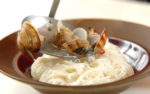 1、鍋にゴマ油を熱し、ニンニク、ショウガ、赤唐辛子を弱火で炒める。香りがたったら火を強め、アサリと<スープ>の材料を加え、煮たったらアクを取って塩コショウで味を調える。