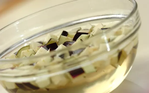 1、ナスは1cm角程度の大きさに切り、水に放ってアク抜きをする。パプリカ、ピーマンは種を取り、他の野菜も全て1cm角ぐらいの大きさに切りそろえておく。