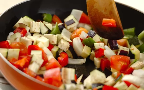 2、フライパンにオリーブ油、薄切りにしたニンニクを入れ弱火で香りが出るまで熱し、切った野菜を入れて炒める。油が回ったら蓋をして弱火にし、5分ほど蒸し煮にする。
