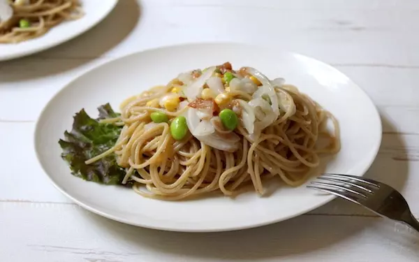 今回は、玉ねぎを加えてオリーブオイル風味の冷製パスタにしてみました。大人はパスタに青じそやパセリを加えると風味よくいただけます。