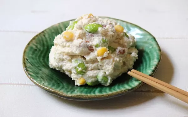 塩ゆでして水気をしっかり切った豆腐と梅干しをすり鉢ですり、ゆでた枝豆とトウモロコシと白すりごまを加えれば、簡単白和えに。緑と黄色、白の彩りがきれいで食欲がそそられます。