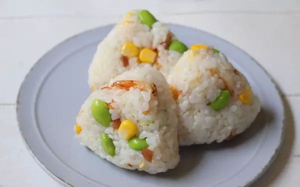 「枝豆とトウモロコシのさっぱり混ぜご飯」に、桜エビを加えておにぎりにしてみました。じゃこやおかか、ナッツなどを加えてもおいしく仕上がります。